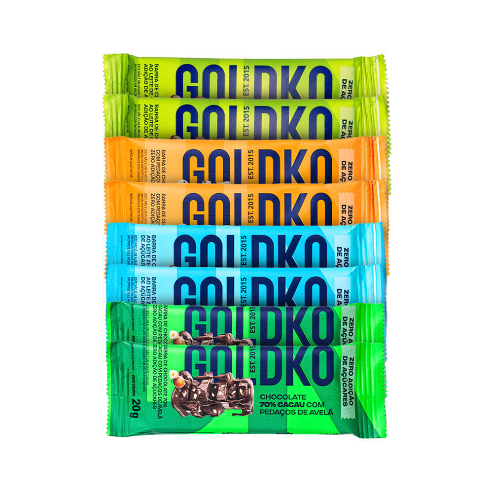 Kit Contém: 2x Barra de chocolate branco com cookies zero adição de açúcares - 20g 2x Barra de chocolate ao leite zero adição de açúcares - 20g 2x Barra de chocolate ao leite de coco zero adição de açúcares - 20g 2x Barra de chocolate 70% cacau zero adição de açúcares - 20g