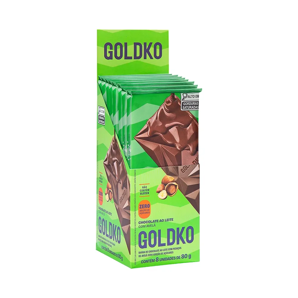 Display com 8 barras de chocolate ao leite com pedaços de avelã zero adição de açúcares. Cremosidade e crocância em uma combinação irresistível 80g cada.