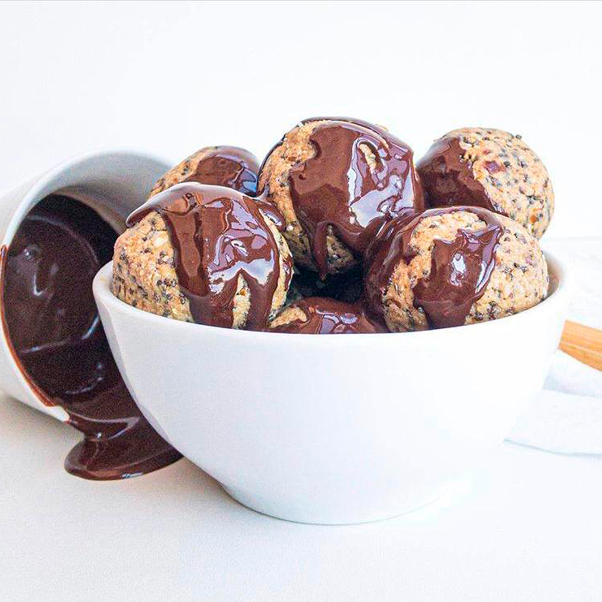 Depois é só fazer as bolinhas e cobrir com chocolate 80% cacau zero açúcar GoldKo.