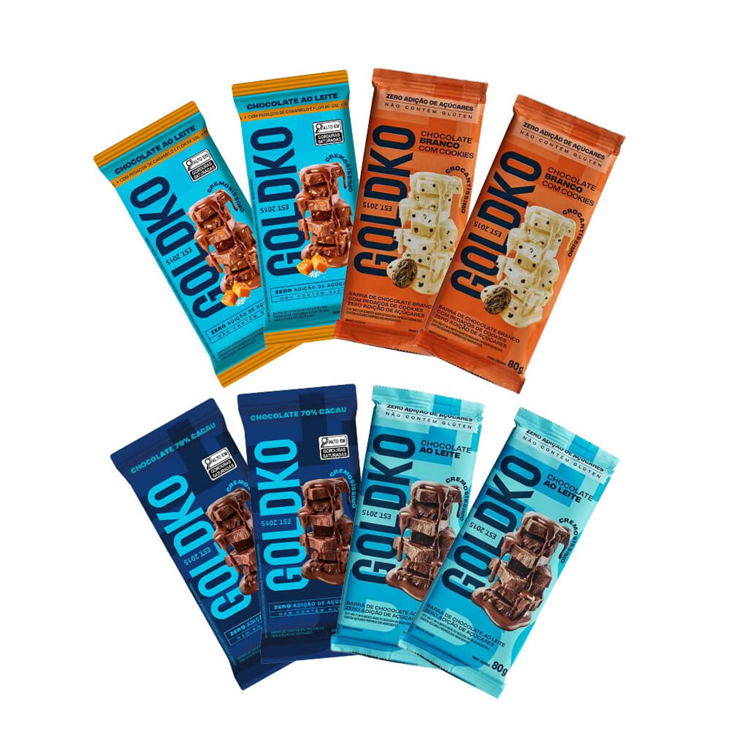 Quem resiste as barras de chocolate mais amadas da Goldko? Agora você pode ter todos em um só no Kit Barras Mais Vendidas zero adição de açúcares! Este kit reúne as barras mais vendidas da GoldKo, escolhidas especialmente para quem não abre mão de um chocolate com sabor surreal , mas sem açúcares adicionados.