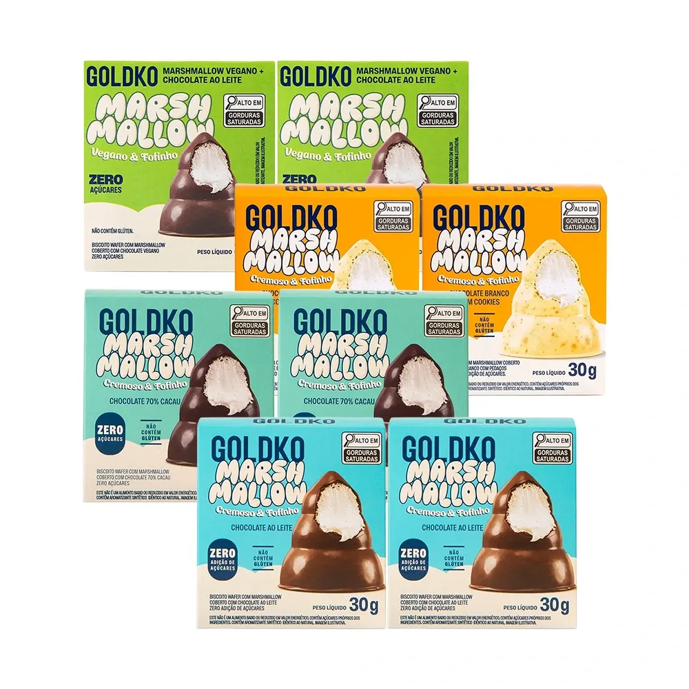 Esse kit é ideal para experimentar todas as versões dessa delícia, recheio cremoso de marshmallow, base de biscoito crocante e cobertura de chocolate zero adição de açúcares. Uma combinação surreal que conquista desde a primeira mordida!