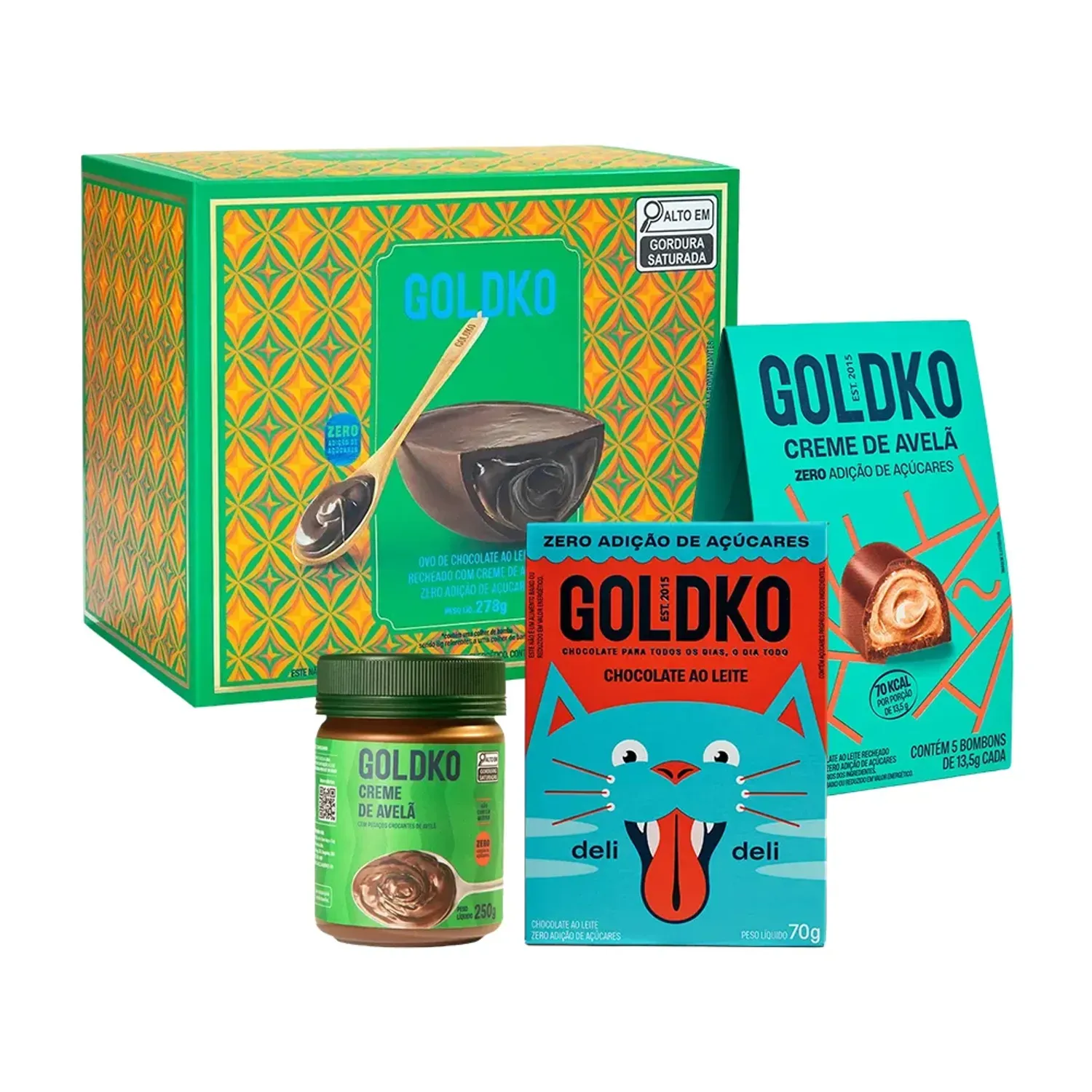 O Kit Ovo de Chocolate ao Leite com Creme de Avelã GoldKo traz chocolate cremoso, recheio irresistível e zero adição de açúcares, perfeito para presentear ou se presentear.