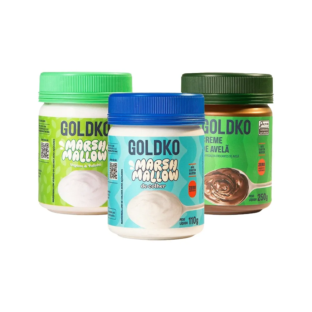 Juntamos todos os potes irresistíveis da GoldKo em um só kit para proporcionar uma explosão de sabor e textura em cada colherada! Este kit inclui o delicioso creme de avelã com pedaços crocantes e os primeiros marshmallows zero e veganos do mundo. Cada produto foi cuidadosamente desenvolvido para oferecer uma experiência única, com um sabor surreal.