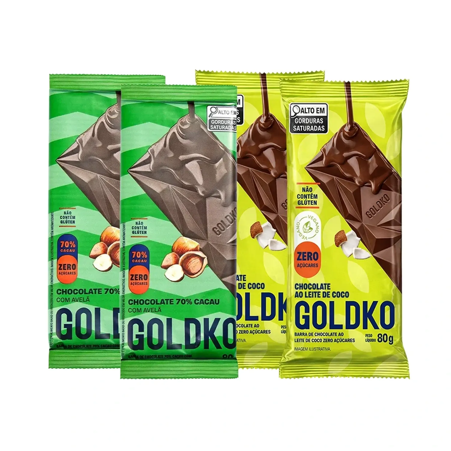 Kit Contém: 2 x Barra de Chocolate ao Leite de Coco -80g 2 x Barra de Chocolate 70% Cacau com Avelã -80g